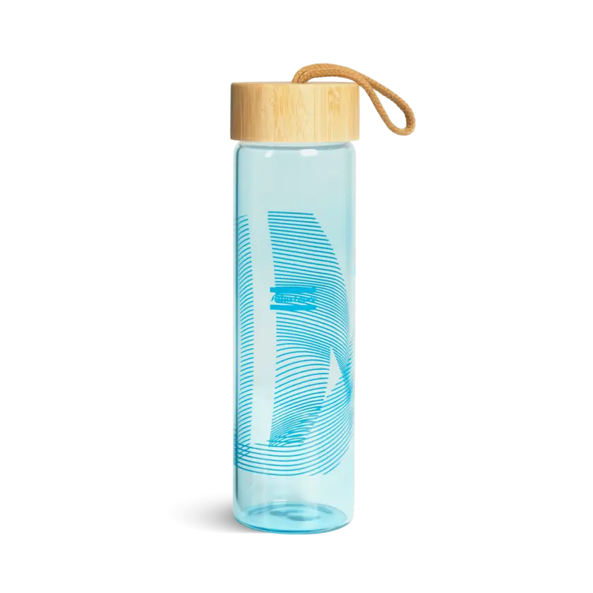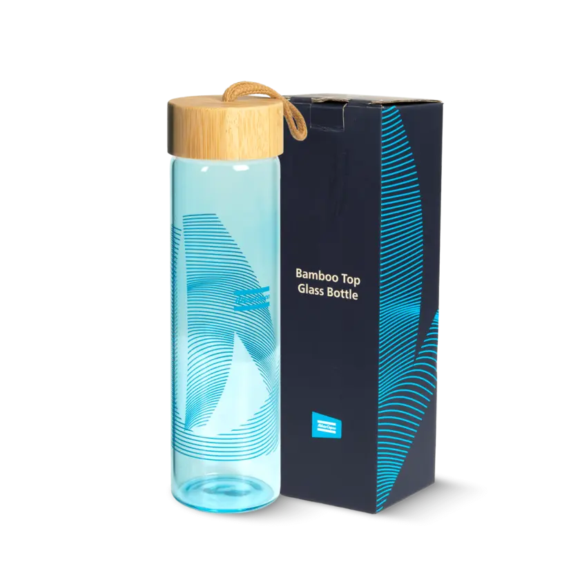 This glass bottle combines several materials to form a refined design. The top is made from bamboo wood and features a tactile carrying cord, and the body carries the Atlas Copco slogan and blueprint pattern. Comfortable to handle and a decorative element atop work desks and conference tables. The bottle comes in its own custom printed gift box. Not suitable for dishwashers.