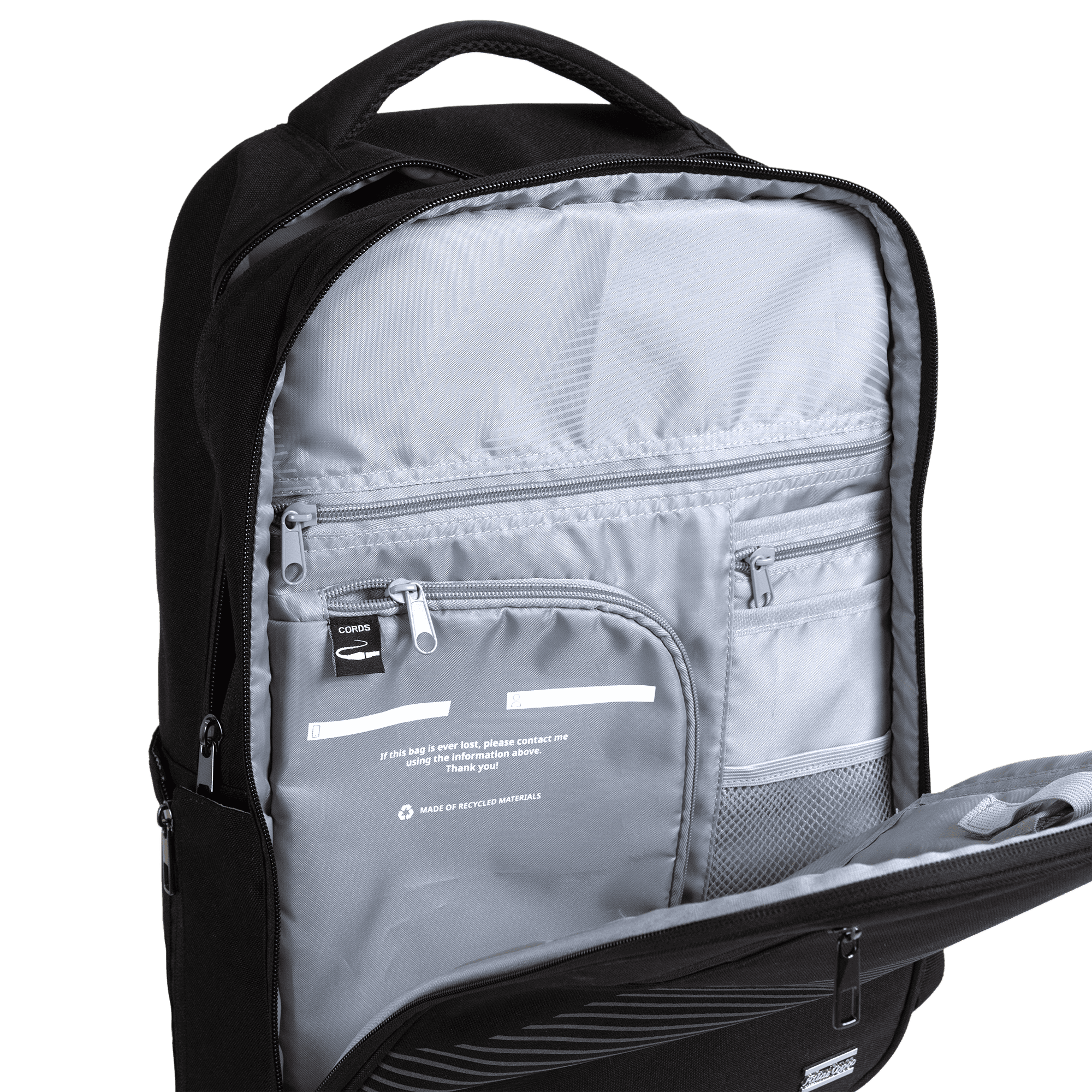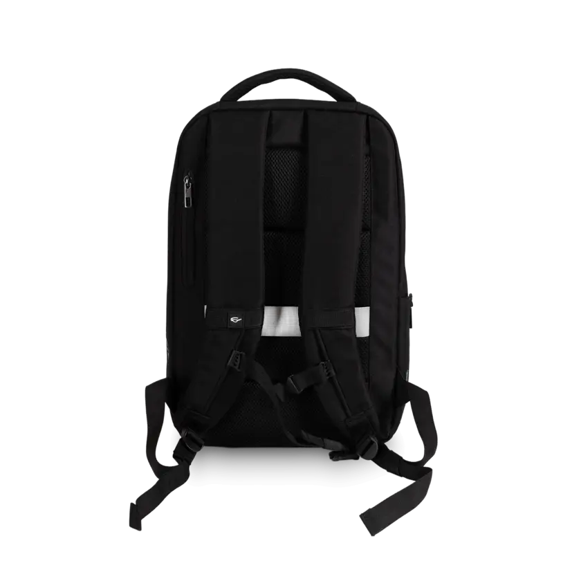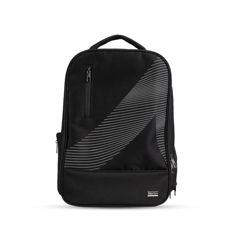 Durable backpack in recycled, water-resistant fabric with reversed zippers and reflective details. Features a padded laptop compartment and organized storage. Finished with a metallic 3D silver Atlas Copco logo - combining functionality, innovation, and a clean professional look.