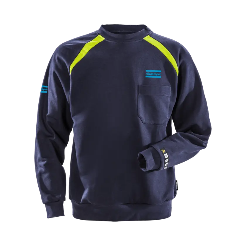 Comfortable flame-protected sweatshirt with inherent flame protection, designed for both safety and comfort. The sweatshirt features bright yellow inserts on the shoulders to increase visibility. It offers certified multinorm protection, inherent flame-resistant properties, and a soft, comfortable feel for everyday wear. Please note: This is an On Demand item, which means it is printed specifically upon order. As a result, the delivery time will be approximately two weeks longer than usual. Also, no returns due to the same reason.