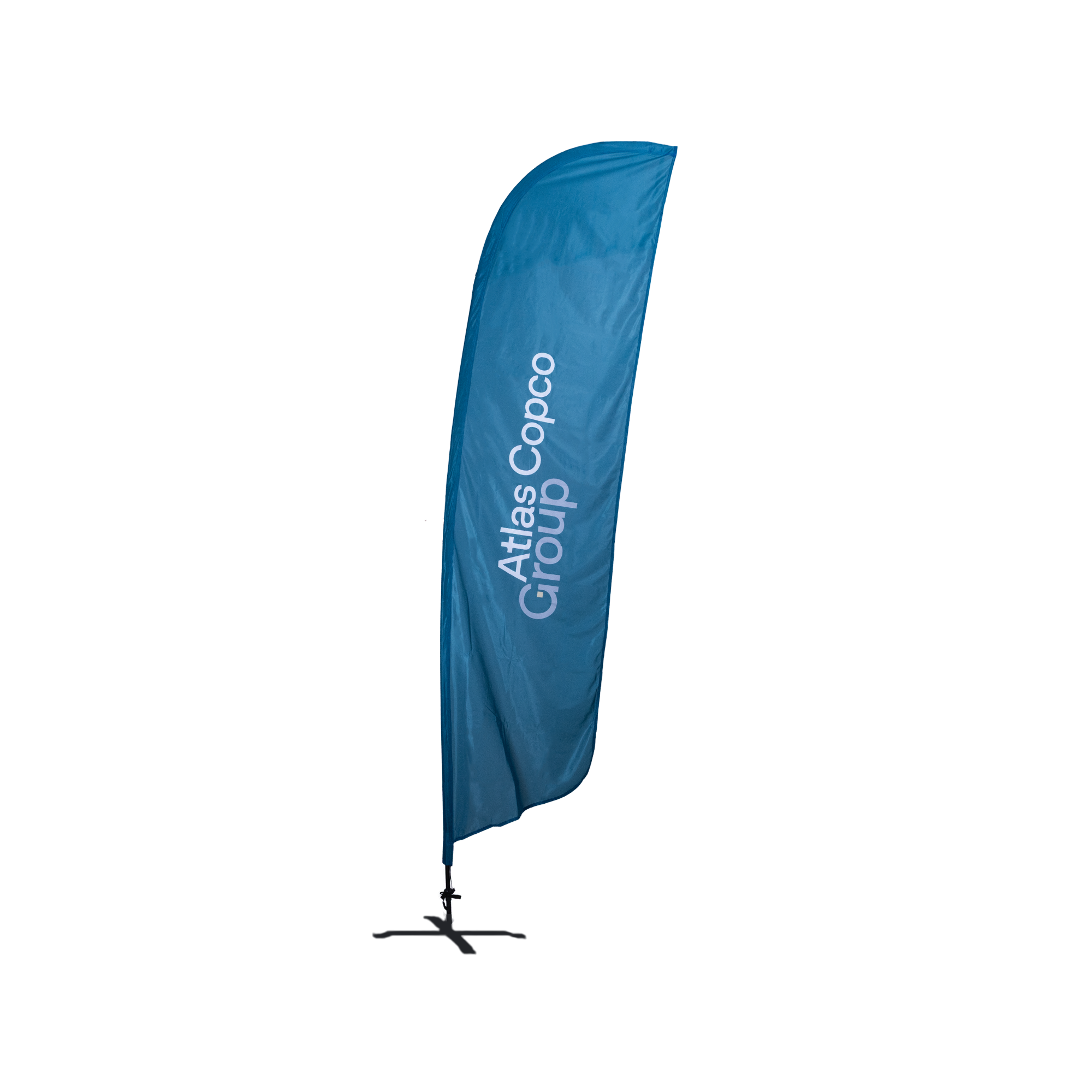 This beach flag with your printed logo is eye-catching and perfect to use during your events. Size of flag: 75x315 cm. The flag kit includes baseplate, pole, ground screw and water bellow.
